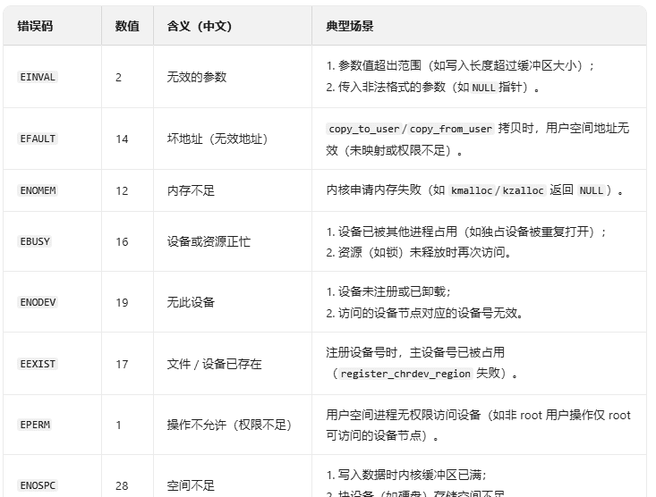 错误码的返回形式:驱动中需返回 “负的错误码”(如 -EINVAL),内核会自动转换为用户空间的 errno(正数)。