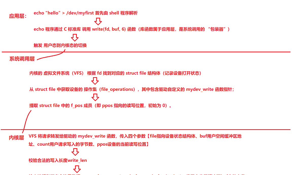 3、写函数的流程:用户请求→内核校验(校验count是否超出缓存区大小)→安全传输(copy_from_user)→状态更新(更新ppos)→反馈结果(实际写入数据大小)