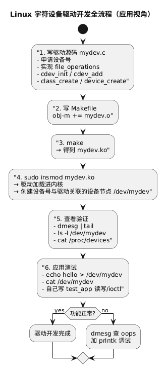 2、设备号:每个字符设备由 “主设备号(major)+ 次设备号(minor)” 唯一标识,主设备号标识驱动类型,次设备号标识具体设备。