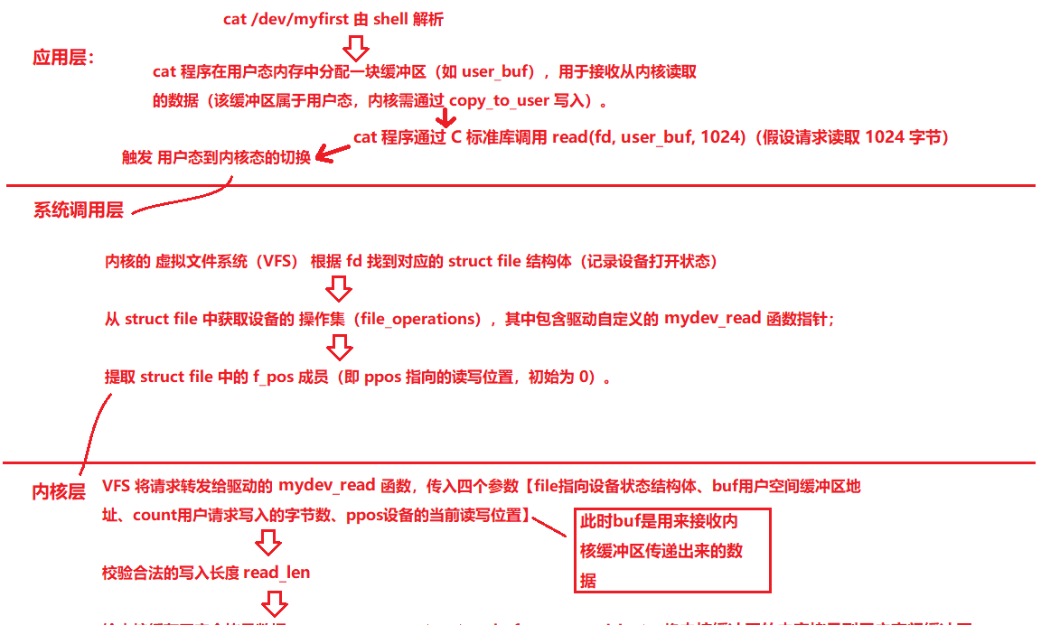 3、读函数流程:用户请求→内核校验(ppos是否超出可读取范围,求出可读取值的数量)→安全传输(copy_to_user)→状态更新(更新ppos)→反馈结果(反馈读取值的数量)