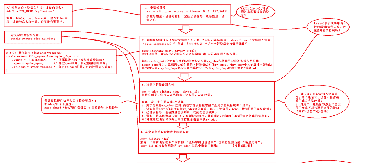字符设备的注册流程:申请设备号(register_chrdev_region或alloc_chrdev_region)。初始化cdev:cdev_init(&my_cdev, &fops)(绑定file_operations)。注册到内核:cdev_add(&my_cdev, devno, count)(count为设备数量)。注销流程:从内核移除设备:cdev_del(&my_cdev)。释放设备号:unregister_chrdev_region(devno, count)(与注册时的count一致)。
