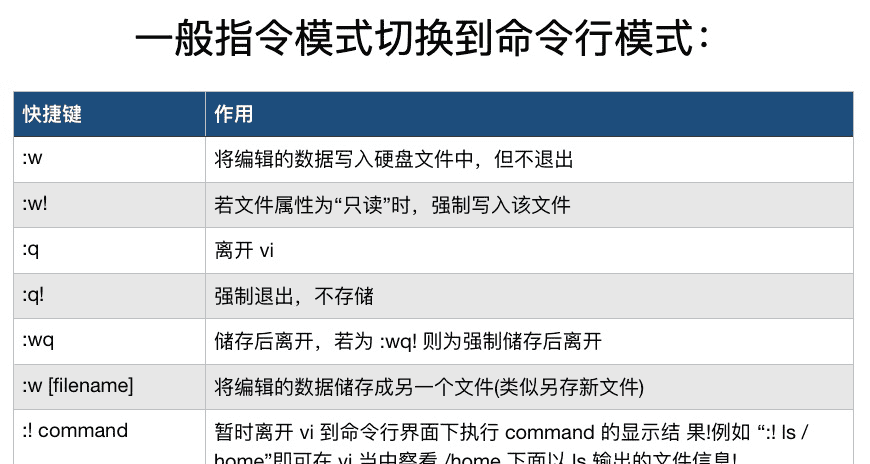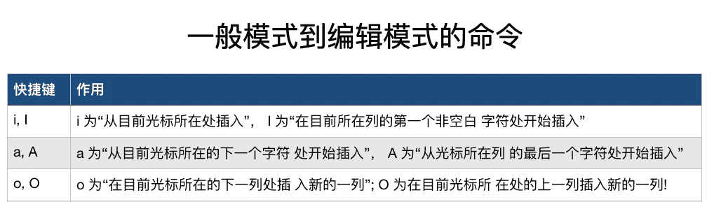 通过下面的命令,可以进入编辑模式对文件内容进行处理,通过 esc 退出到一般命令模式。