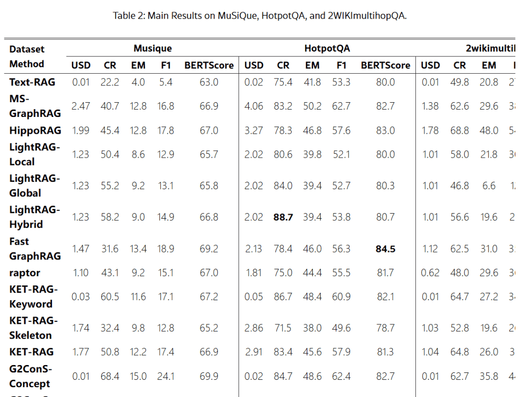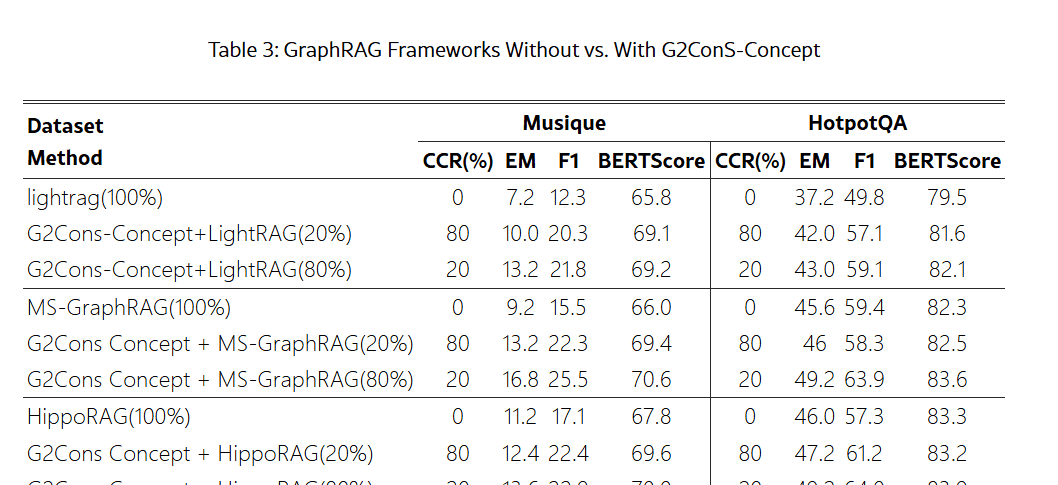研究团队在三个广泛使用的多跳问答基准数据集上评估了G2ConS的性能:Musique、HotpotQA和2wikimultihopqa。遵循先前工作的做法,从每个数据集的验证集中采样500个问答对,收集所有相关的支持和干扰段落来构建RAG的外部语料库。