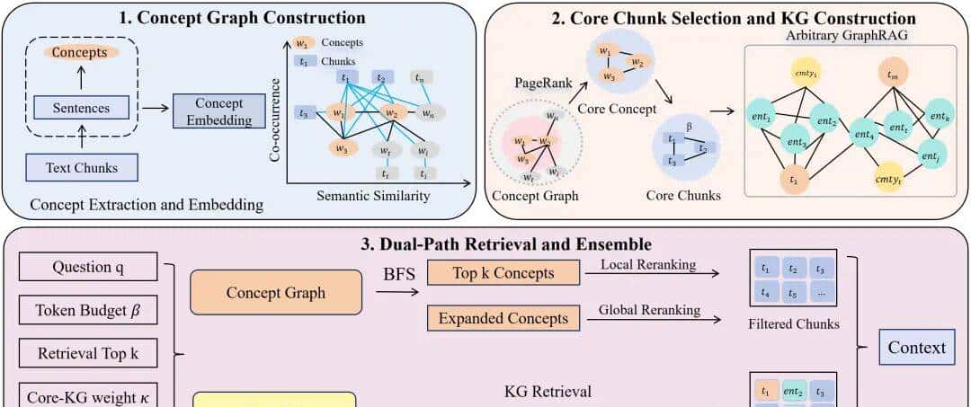对于第一个挑战,引入核心块选择,通过移除低排名概念来减少输入块,从而在不修改图构建过程的情况下降低构建成本。对于第二个挑战以及由块选择引起的知识缺口,提出概念图检索方案。