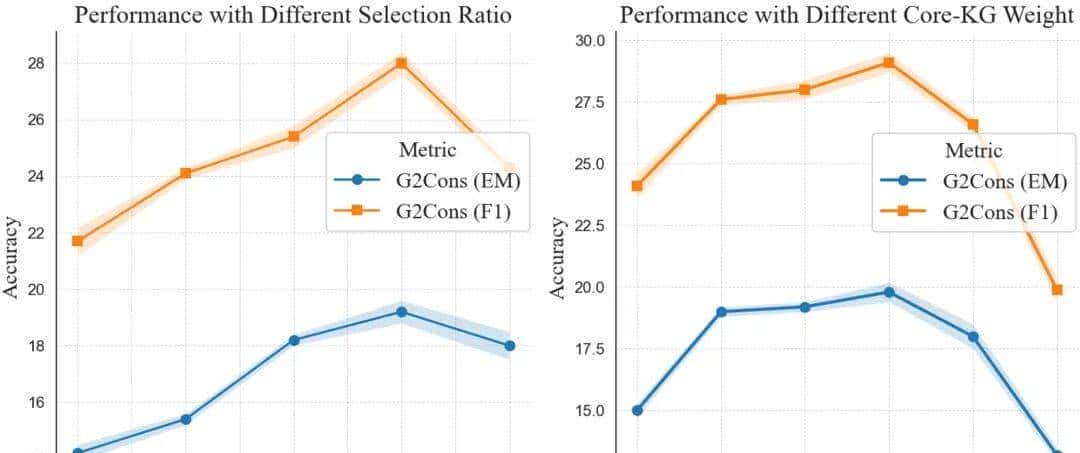 当λ=0.2时性能快速增长,然后增长放缓,在λ=0.6时达到峰值后开始下降。这表明最优融合需要平衡G2ConS-Concept和G2ConS-Core-KG的贡献:λ值过小会导致结构化知识利用不足,过大则会削弱语义信号。