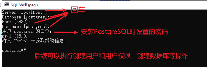 提示 Database [postgres]: 时,按回车(使用默认数据库postgres)。