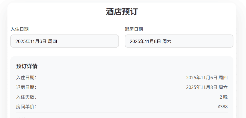 日期输入区域 – 两个只读输入框分别用于显示入住和退房日期日历选择器 – 弹出式日历组件,支持月份切换和日期选择预订摘要 – 展示预订详细信息和费用计算结果