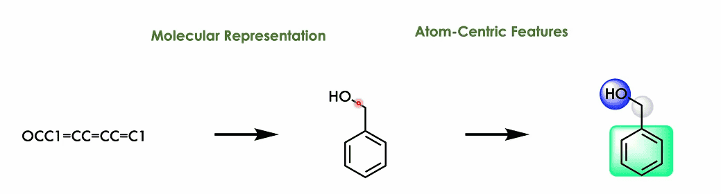 识别分子的特征可以小到单个原子,再大点比如分子子结构(官能团)和环结构等等。这里仅仅作为举例,实际上可能将该分子片段化为更小的特征。