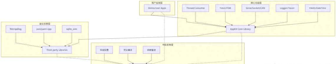 AppKit是一个专注于嵌入式Linux应用开发的C++14框架,它的核心目标是提升开发效率和应用健壮性。AppKit提供了一套经过验证的工具集,覆盖了线程管理、定时器、文件IO、串口通信、网络通信、CAN总线、GPIO控制等嵌入式开发中的高频需求。