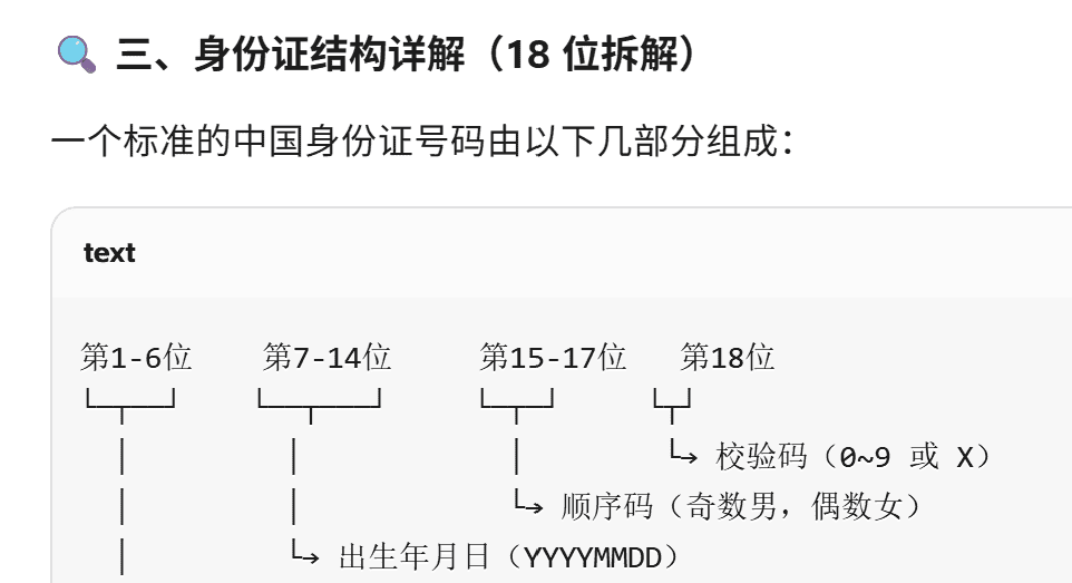 地区码 + 出生年月日 + 顺序码 + 校验码(含 X)