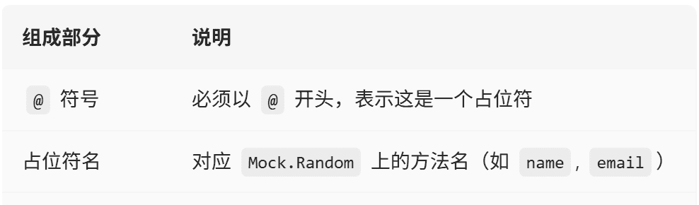 DPD(数据占位符定义)它允许你在 JSON 模板中使用类似 @name、@email() 这样的“占位符”,让 Mock.js 自动替换成真实的数据。