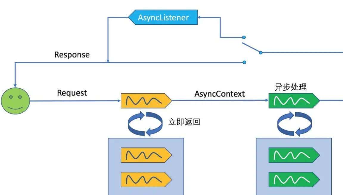 Servlet 3.0之前,Servlet采用Thread-Per-Request的方式处理请求,即每一次Http请求都由一个线程从头到尾处理。当涉及到耗时操作时,性能问题便比较明显。Servlet 3.0中提供了异步处理请求。可以先释放容器分配给请求的线程与相关资源,减轻系统负担,从而增加服务的吞吐量。Servlet 3.0的异步是通过AsyncContext对象来完成的,它可以从当前线程传给另一个线程,并归还初始线程。新的线程处理完业务可以直接返回结果给客户端。