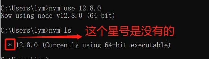 第一 nvm安装成功,使用 nvm Install 12.8.0 安装node版本也是成功的,但是 使用 nvm use 12.8.0 后,重新nvm ls,出现的列表版本的当前版本没有 * 号,即nvm use 12.8.0 未成功