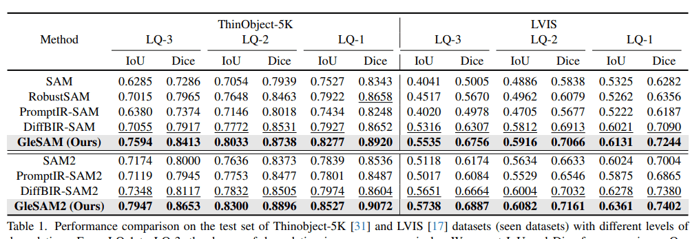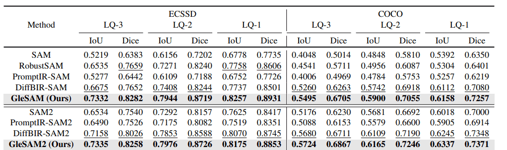 实验结果表明,GleSAM在保持清晰图像性能的同时,显著提升了在退化图像上的分割鲁棒性,并且具有良好的泛化能力。