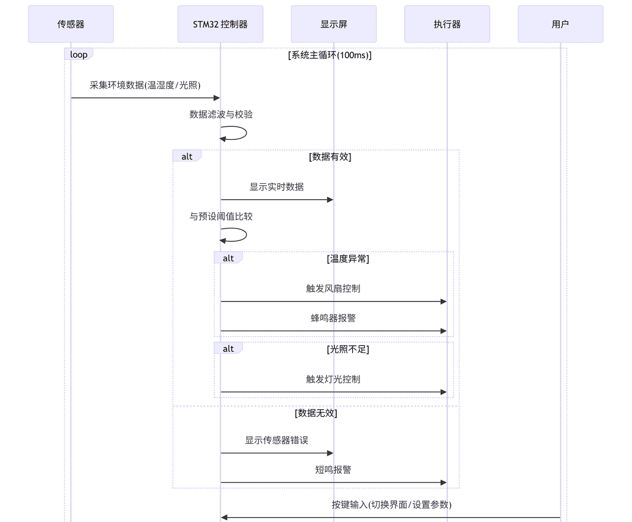 sequenceDiagram participant S as 传感器 participant C as STM32控制器 participant D as 显示屏 participant A as 执行器 participant U as 用户 loop 系统主循环(100ms) S->>C: 采集环境数据(温湿度/光照) C->>C: 数据滤波与校验 alt 数据有效 C->>D: 显示实时数据 C->>C: 与预设阈值比较 alt 温度异常 C->>A: 触发风扇控制 C->>A: 蜂鸣器报警 end alt 光照不足 C->>A: 触发灯光控制 end else 数据无效 C->>D: 显示传感器错误 C->>A: 短鸣报警 end U->>C: 按键输入(切换界面/设置参数) C->>D: 更新显示界面 end