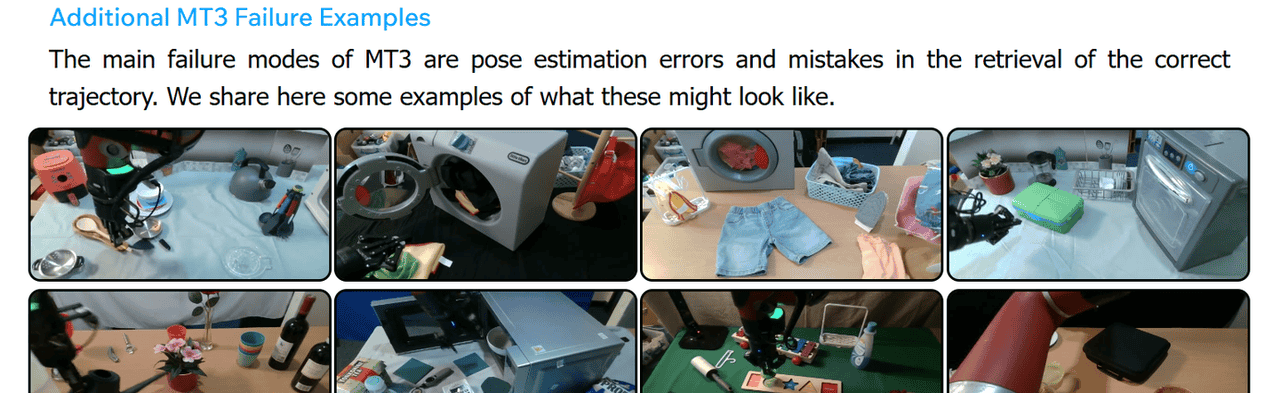 但凡是训练就不可能没有失败,团队po出了MT3失败模式的差异情况,问题主要是姿态估计误差和正确轨迹检索失误。