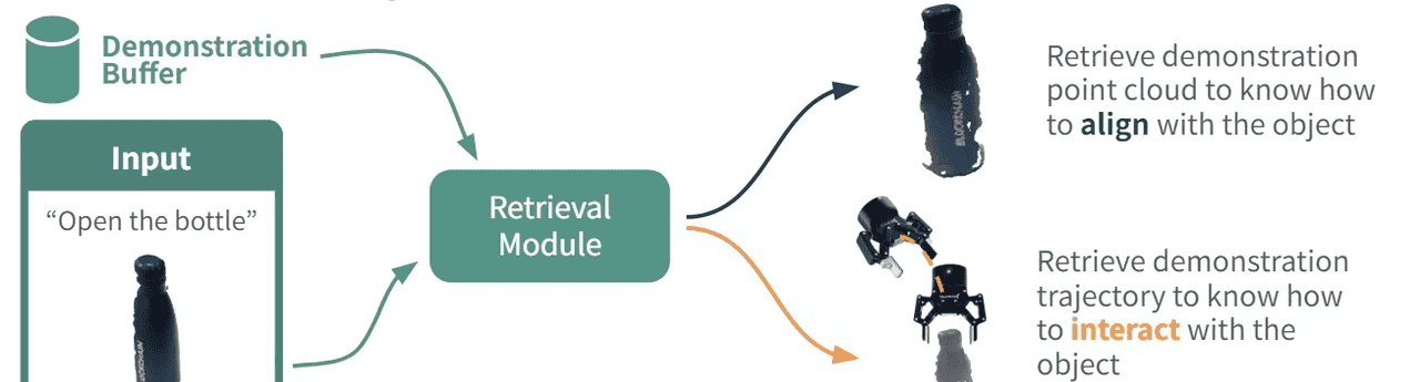 通过在 70 种不同物体上进行的 3450 次真实世界实验(循环),实验结果明确表明,将操作轨迹分解为对齐阶段和交互阶段,其性能优于使用单一整体策略学习轨迹。与使用行为克隆替代方案相比,采用基于检索的方法进行物体对齐和交互,能实现更高效的学习。