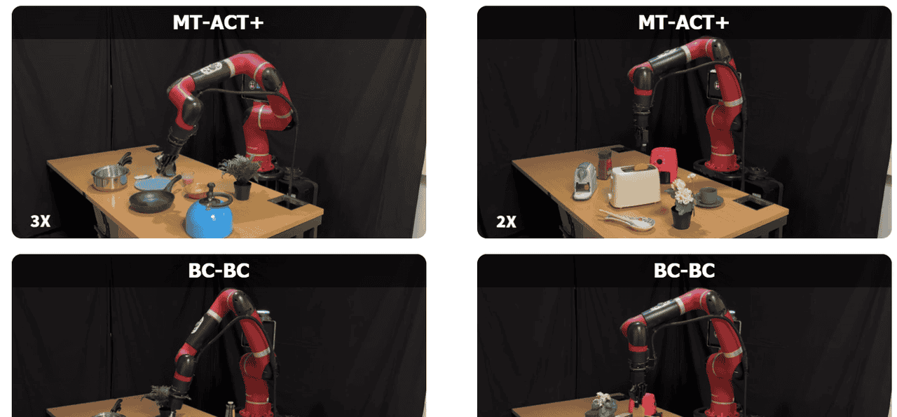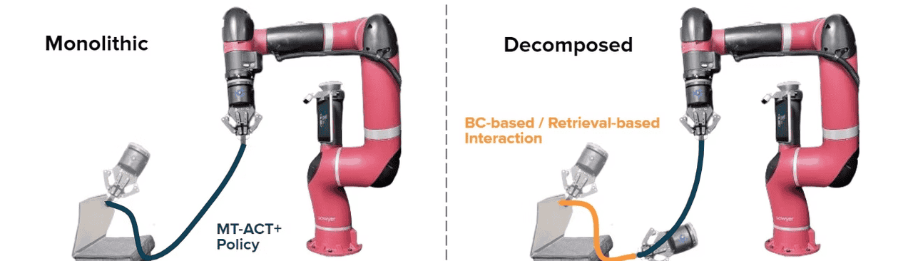 BC-BC:对齐阶段采用行为克隆,交互阶段采用行为克隆;BC-Ret:对齐阶段采用行为克隆,交互阶段采用基于检索的方法;Ret-BC:对齐阶段采用基于检索的方法,交互阶段采用行为克隆;Ret-Ret(MT3):对齐阶段采用基于检索的方法,交互阶段采用基于检索的方法;MT-ACT+:在整个轨迹上训练的行为克隆策略。