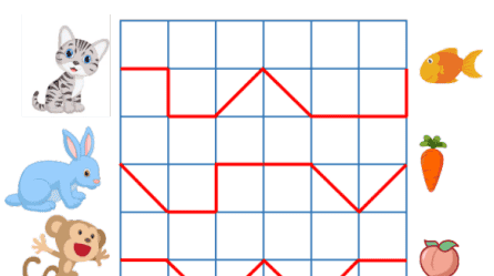 下图中,每个小方格都是正方形。小猫、小兔和小猴以相同的速度沿面前的红色路线同时出发,谁 先吃到食物?( )