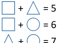 主要考查小朋友们的观察能力和推理能力,从给定的图中的前两个算式中可以知道,圆形比三角形大1,再从第三个算式中:三角形加上圆形等于7,结合前一步得到的所以三角形是3,圆形是4;答案C