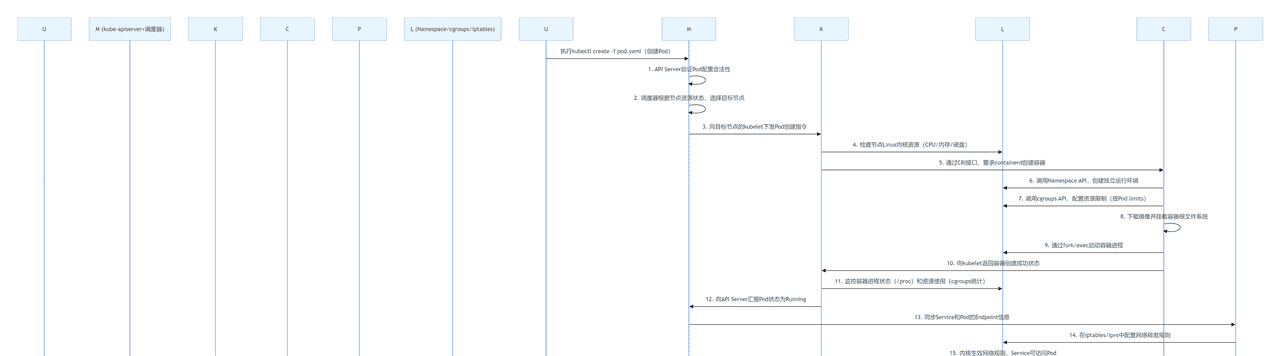 下面用 Mermaid 时序图,还原从执行到 Pod 在节点上成功运行的全流程,每个环节都标清组件交互和 Linux 的参与点: