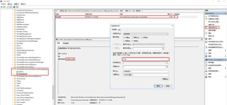 应用程序和服务日志 -> Microsoft -> Windows -> TerminalServices-RemoteConnectionManager->Operational,事件ID 1149为RDP登录成功日志,会记录源IP和用户。