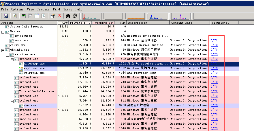 或者使用微软提供的procexp,他支持自动上传进程文件至virustotal