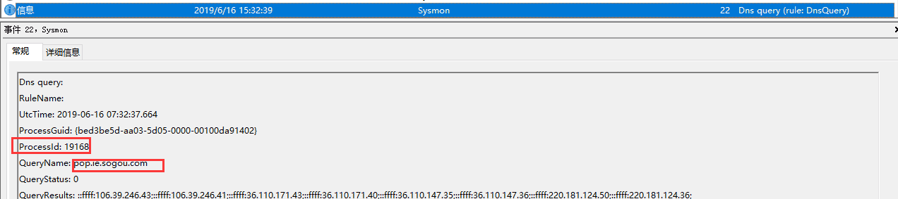 事件ID22,是这次重磅推出的新功能,DNS查询记录,这功能让应急响应人员可以很轻松的通过域名定位到进程,并且你即使开启了dnscache服务,也能定位到原先进程。dnscache是一个缓存服务,简单来讲,就是会代理其他进程进行dns解析,并且会缓存解析结果,下一次解析就不再发送请求,读取缓存内容返回给指定程序即可。所以大家使用内存扫描工具,可能会定位到dnscache服务进程。