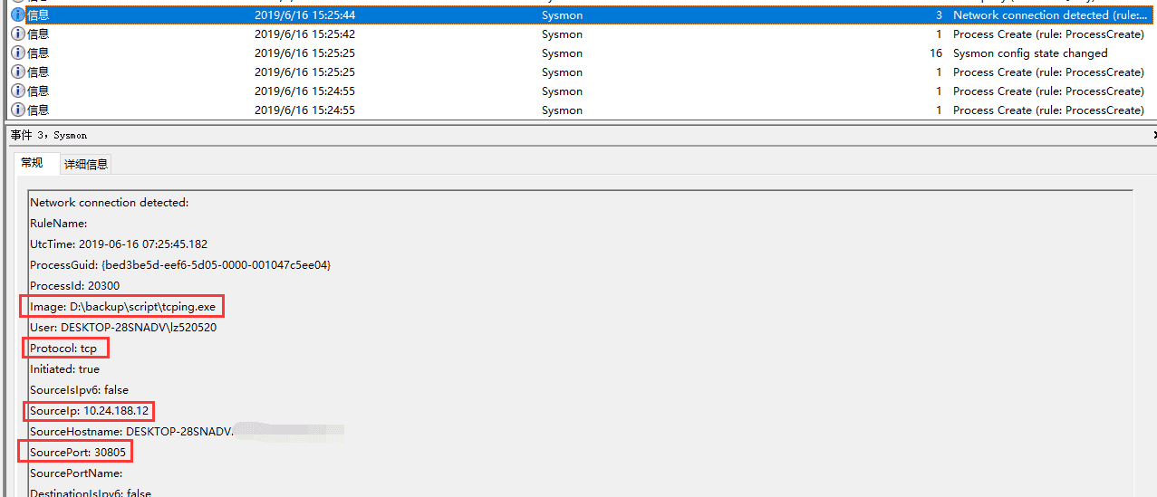 事件ID3,监控网络连接,当恶意程序外连CC服务器或者矿池等操作的时候,可以监控到是哪个进程发起的连接。这边也举个例子,之前遇到一种病毒,当你去用进程管理器或分析工具去查看时,该病毒会自动退出,防止被检测到,并且随机一段时间重启,但态势感知上发现确实有挖矿行为,使用sysmon监控,当他不定时运行时,即可捕捉到他连接矿池的行为,从而定位到进程。