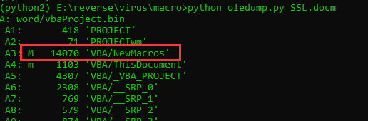 oledump.py是一个用于分析OLE文件(复合文件二进制格式)的程序,而word、excel、ppt等文档是OLE格式文件的,可以用它来提取宏代码。