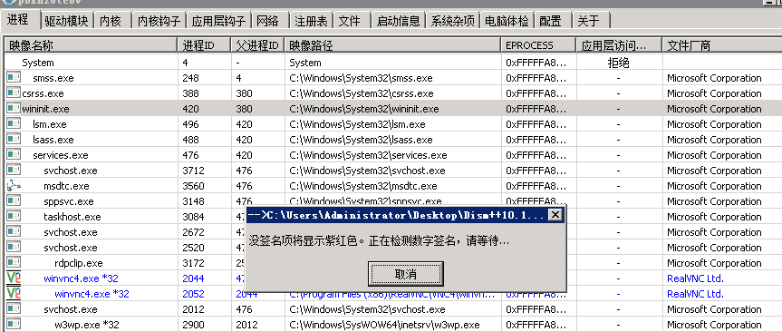 遇到这种,我们可以使用PCHunter对所有进程文件校验签名,检查无签名或签名可疑的进程。