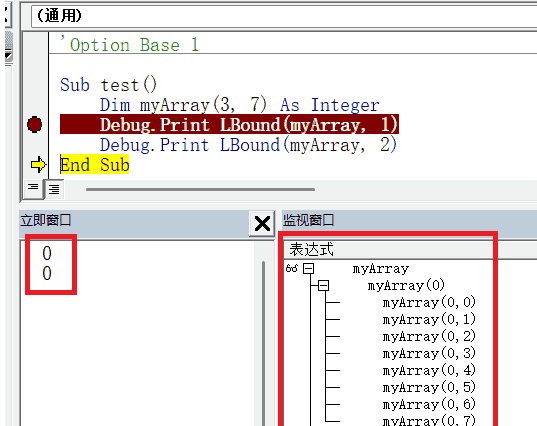 如果只给出索引的上界,VBA会使用默认的下界。默认下界通常为0。而以下语句声明的是一个 4行8列 的整形数组(索引范围:行 0 to 3,列 0 to 7),索引均从0开始: