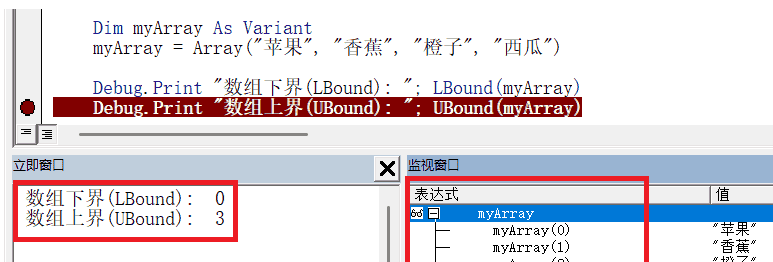 Dim myArray As VariantmyArray = Array("苹果", "香蕉", "橙子", "西瓜")Debug.Print "数组下界(LBound): "; LBound(myArray)Debug.Print "数组上界(UBound): "; UBound(myArray)