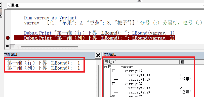 Dim varray As Variantvarray = [{1, "苹果"; 2, "香蕉"; 3, "橙子"}] '分号 (;) 分隔行,逗号 (,) 分隔列Debug.Print "第一维(行)下界 (LBound): "; LBound(varray, 1)Debug.Print "第二维(列)下界 (LBound): "; LBound(varray, 2)