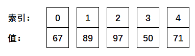 我们使用基本的方块图表示,这种表示方式非常直观地体现了数组在内存中连续存储的特性,并清晰地展示了数组的索引和每个位置对应的值: