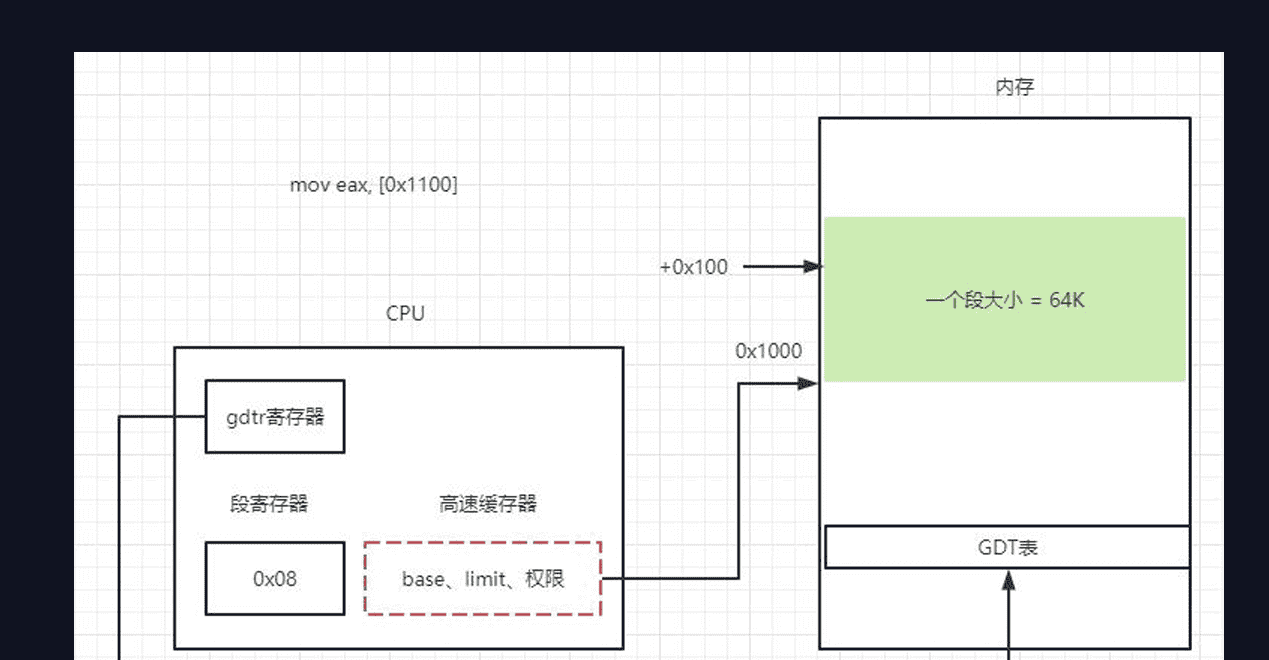 说白了就是往“ds:[0x100]”所指向的内存地址写一个0,其中0x100为段内偏移offset,ds里面的东西指向base,最终要拿到的地址为base+offset,而如何得到base,那就是段部件需要解决的核心问题。