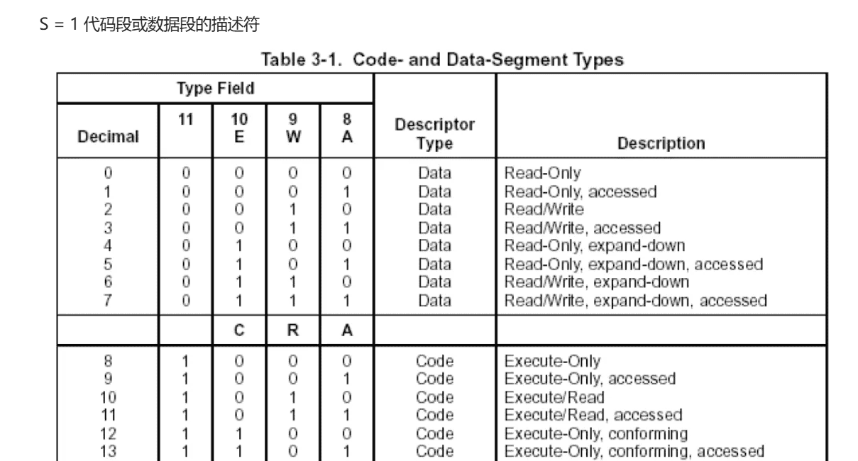 S:表示该段的类型(1表示数据段或者代码段,0表示系统段)