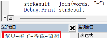 Dim words() As VariantDim strResult As Stringwords = Array("苹果", "橙子", "香蕉", "葡萄")strResult = Join(words, "-")Debug.Print strResult