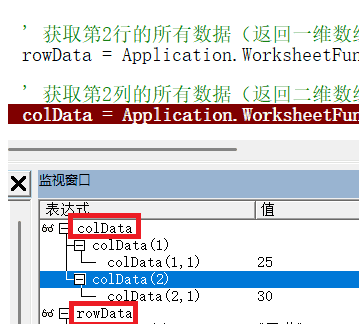 Dim arrData As VariantDim rowData As Variant, colData As VariantarrData = Evaluate("{""张振"",25,""男"";""王琳"",30,""女""}")' 获取第2行的所有数据(返回一维数组)rowData = Application.WorksheetFunction.Index(arrData, 2, 0)' 获取第2列的所有数据(返回二维数组)colData = Application.WorksheetFunction.Index(arrData, 0, 2)