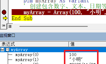 Dim myArray As Variant' 创建包含数字、文本、日期等不同数据类型的数组myArray = Array(100, "小明", Date, 3.14)