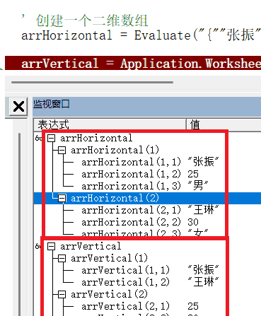 Dim arrHorizontal As VariantDim arrVertical As Variant' 创建一个二维数组arrHorizontal = Evaluate("{""张振"",25,""男"";""王琳"",30,""女""}")arrVertical = Application.WorksheetFunction.Transpose(arrHorizontal)