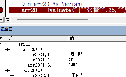 Dim arr2D As Variantarr2D = Evaluate("{""张振"",25,""男"";""王琳"",30,""女""}")