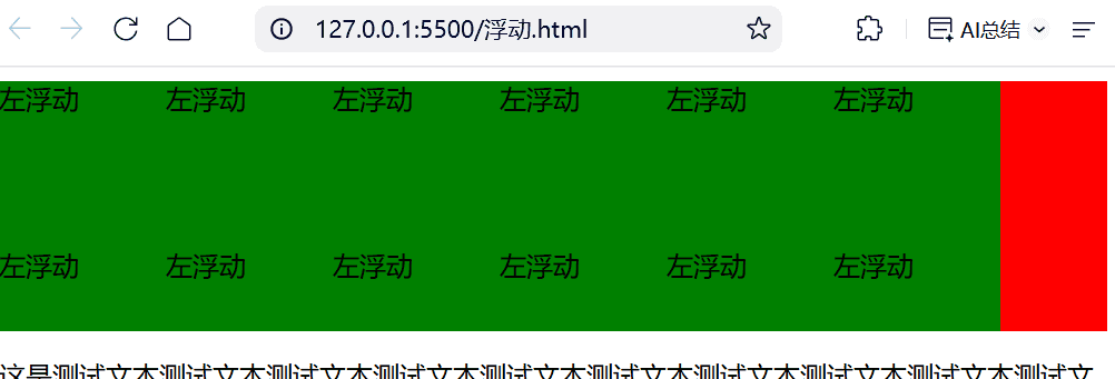 如果遇到下面这种情况就会出现问题,因为左浮动的内容过多会超出父级,导致测试文本显示出现问题