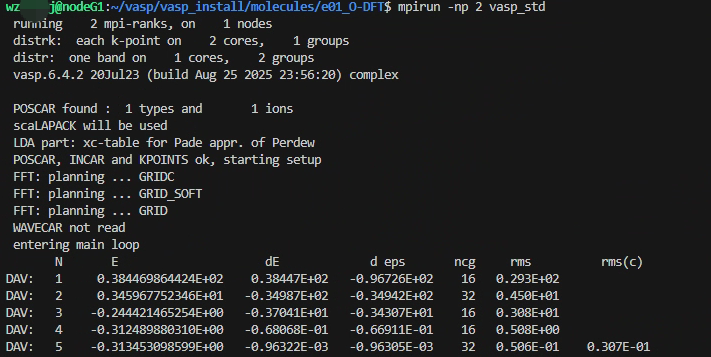 VASP安装成功后,在bin文件夹下产生三个可执行文件(vasp_gam、vasp_ncl、vasp_std),我们主要使用的是vasp_std。下面将调用vasp_std测试VASP的运行。