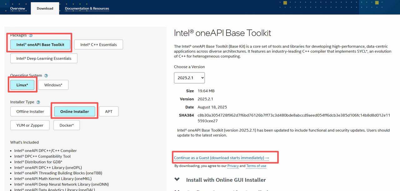 1、下载Base Toolkit安装包:先进入Intel官网下载地址Download the Intel® oneAPI Base Toolkit,选择需要下载的安装包,分为offline和online版本,offline是直接下好安装包了的,而online是提供下载地址,这里我们选择online版本,也可以使用offline再上传至服务器。