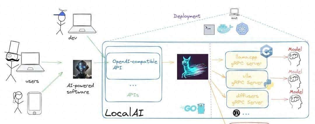 从架构角度看,LocalAI 没有重复造一套推理引擎,它更像是把社区里成熟的组件串起来。上层用 Go 写的 API 层,负责收请求、分发、管理模型等事务;真正做高性能推理的是社区已有的库,列如用 C++ 的 llama.cpp 来跑文本模型,whisper.cpp 处理语音。这样做好处明显:一方面上手门槛低,另一面兼容和性能也更稳。服务间通信可以走 gRPC 或 HTTP,部署上 Docker 最方便,复杂场景可以用 Kubernetes 来做扩展和调度。模型一般从 Hugging Face 之类地方拉,支持文本、图像、音频这些多模态模型接入。