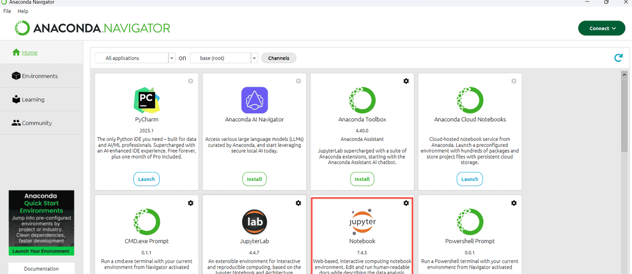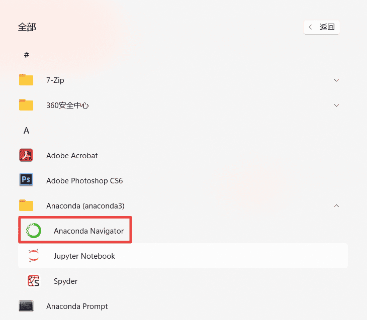 5.在电脑屏幕左下角的开始菜单中找到anacoda3,点击二级菜单Anacoda Navigator,这是一个集成应用软件管理器,可以一键下载和安装各种工具,相当于手机的应用市场,通过打开这个工具,在主页home中安装Jupyter Notebook(编写python代码的工具),写代码都在这里进行。