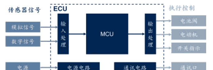 MCU(Micro Control Unit,微控制器)是芯片级的控制核心,更是汽车ECU的“运算大脑”。ECU(Electronic Control Unit,电子控制单元)作为汽车EE架构的基本功能单位,每个ECU对应车辆的一项或一组特定功能(如发动机控制、车身电子控制等),而MCU芯片便嵌入其中承担核心运算任务。其工作流程呈现完整的“信号输入-运算处理-指令输出”闭环:当传感器采集到车辆状态或环境信号后,输入处理器先对信号进行模数转换、滤波放大等预处理,随后传递给MCU进行逻辑运算与决策;运算完成后,输出处理器将结果进行功率放大、数模转换等处理,最终驱动电磁阀、电动机、开关等被控元件执行相应动作。从硬件构成来看,MCU将计算机的CPU、RAM、ROM、定时计数器及多种I/O接口(如CAN、UART)集成于单芯片,这种“一体化集成”设计使其具备体积小、功耗低、成本可控的特点,主要承担车辆中低算力需求的控制任务,是传统汽车电子系统中的基础芯片。
