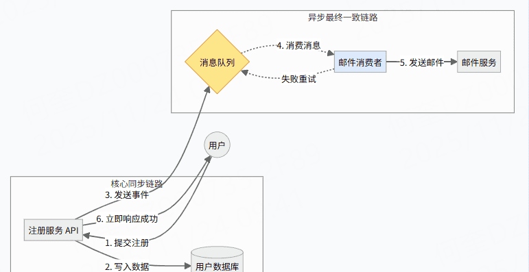 这是 CAP 取舍最经典的落地场景。我们不希望仅仅因为邮件服务器繁忙,就导致用户注册失败。