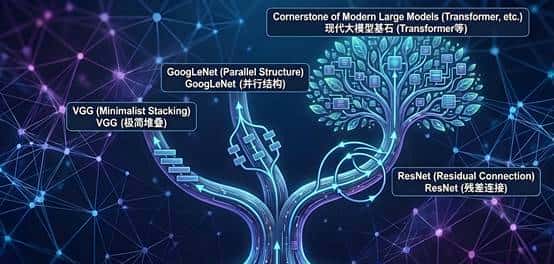 VGG:留下了模块化设计的思想,成为了后续无数模型的“标准积木”。GoogLeNet:启发了人们对网络拓扑结构的探索,证明了“结构大于参数”。ResNet:彻底解锁了深度,成为了今天几乎所有SOTA(最先进)大模型(包括Transformer)的标配组件。没有ResNet,就没有今天的GPT。